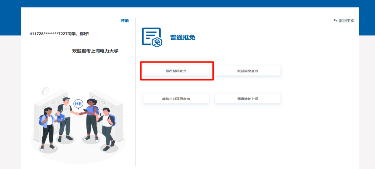 1.点击进入【普通推免】模块,在模块中点击【报名材料补充】;