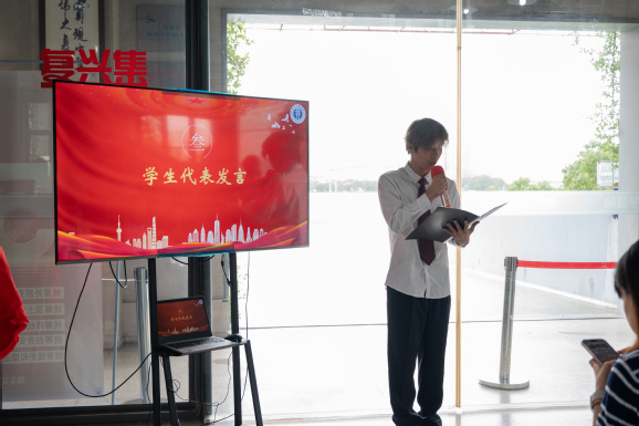 学院学生代表孙晴天发言,结合他两年来在定海路街道的实践经历,讲述了个人将所学知识运用到服务社会,服务社区百姓的心得,并表示将不断提升专业本领,为社区及城市发展注入青春动能。