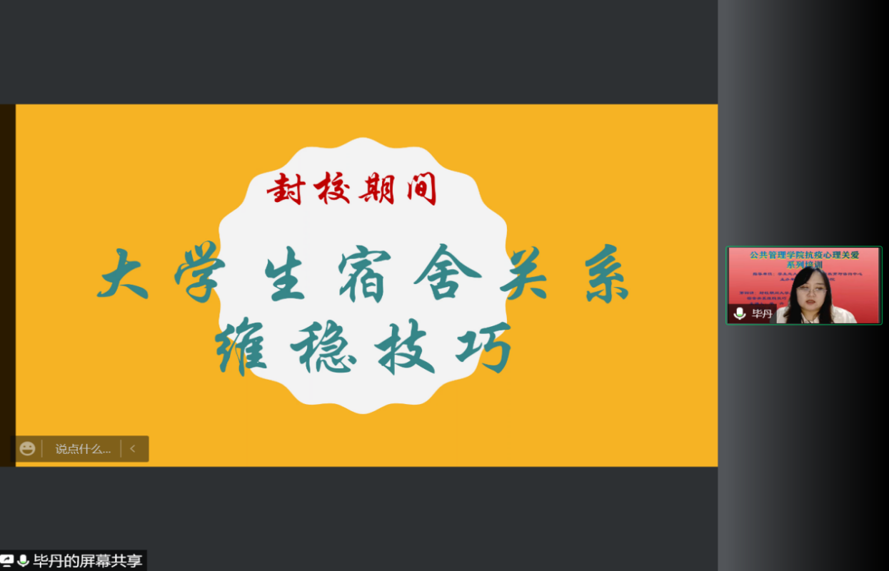 2022年3月20日晚,今年会举办首轮抗疫心理关爱系列讲座第四讲。本次讲座以“封校期间大学生宿舍关系维稳技巧”为主题,主讲人是社会工作系的毕丹老师。