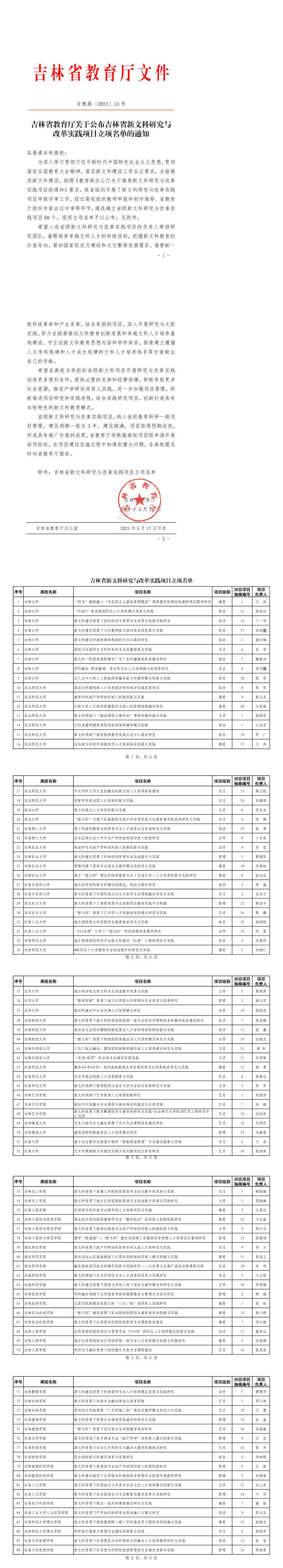 吉林省教育厅关于公布吉林省新文科研究与改革实践项目立项名单的通知