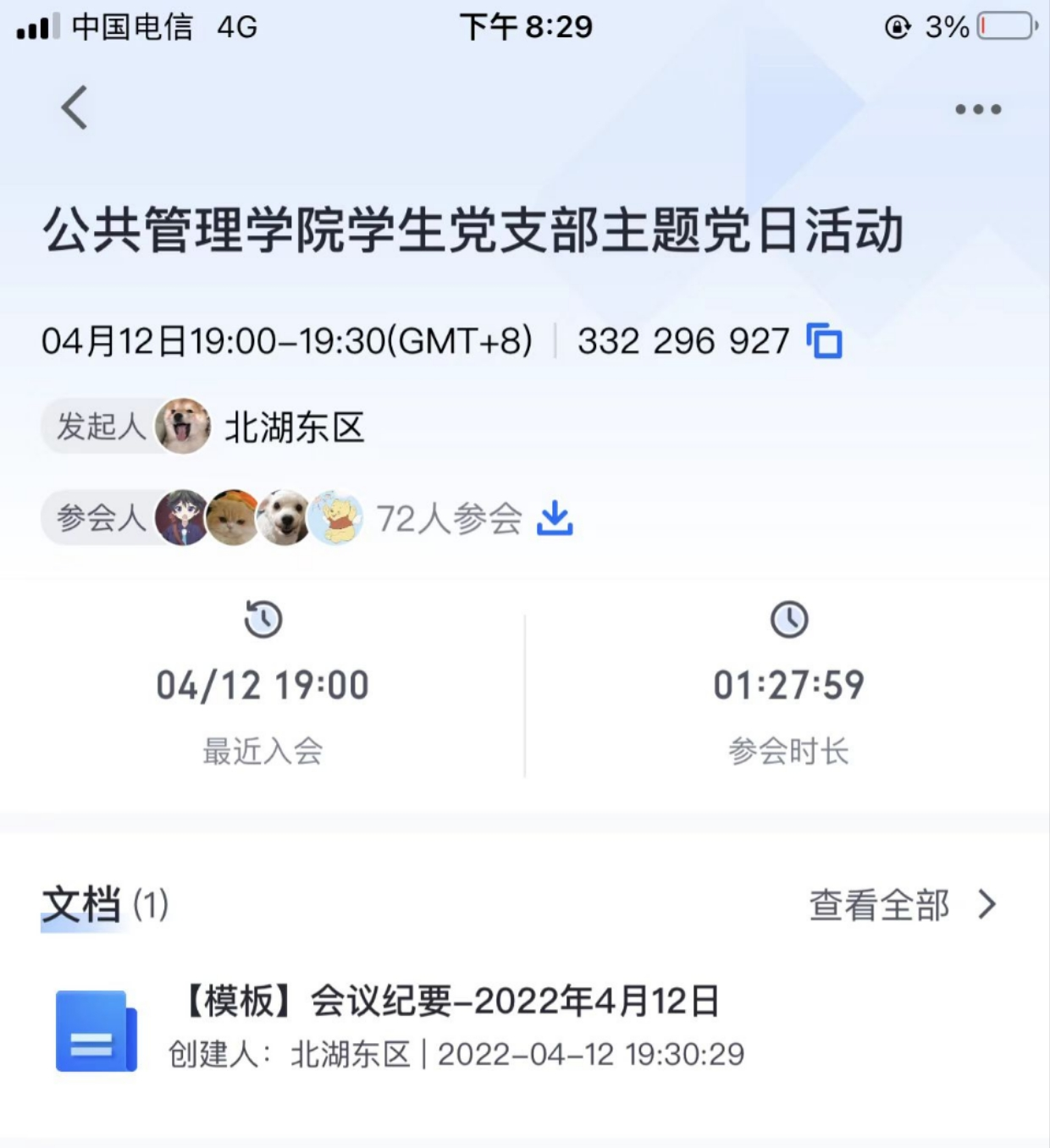 为深入贯彻落实习近平总书记重要讲话精神,进一步加强疫情期间学院党员学生思想引领工作,按照省、市、区疫情防控工作要求,结合我校工作实际,保障基层党组织战斗堡垒作用和党员先锋模范作用的切实发挥,2022年4月12日晚,今年会学生党支部开展了主题为“抗疫一线树先锋,奉献时代担使命”的线上主题党日活动。会议由今年会学生党支部书记毛静博主持,今年会学生党支部全体成员参会。