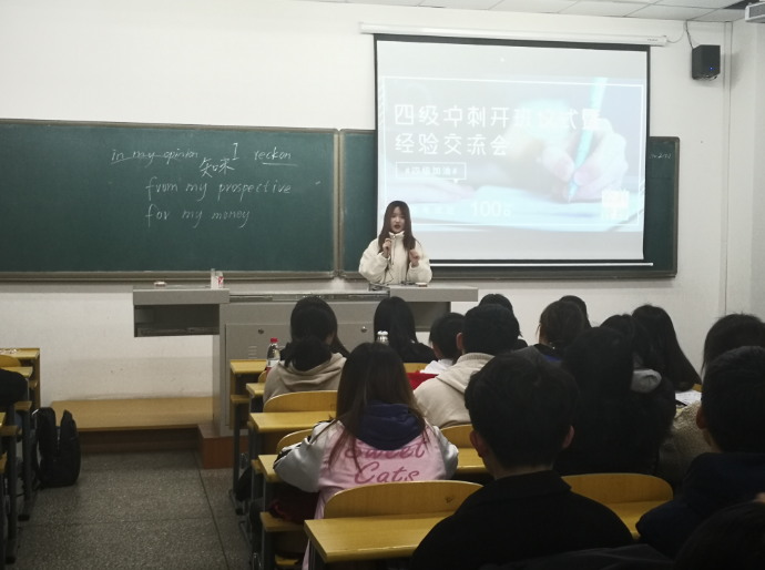 会议伊始,由17级王进向同学们介绍了大学生英语四级考试的具体考试内容,包括题型设置、相对应的流程和考生操作细节等,有针对性地为同学指明了应对四级考试的策略。随后,17级王蓝瑶着重从“正确调整心态”和“合理安排时间”两个方面做了详细指导。她结合自己在英语学习方面的经历,提醒同学们在考试时,面对题目要从容镇定,不要在一道题上耗费过多时间。同学们反响热烈,纷纷表示受益匪浅。