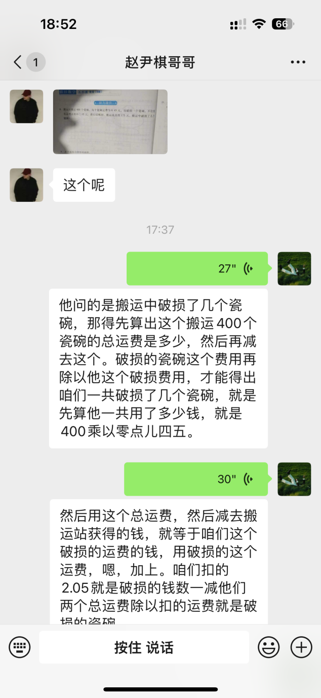 我参与学伴+志愿服务活动,与赵尹棋同学成为“学伴”,我与赵尹棋的哥哥进行联系,了解了她的需求以及学习情况。我们通过线上视频、微信聊天等方法进行作业讲解。