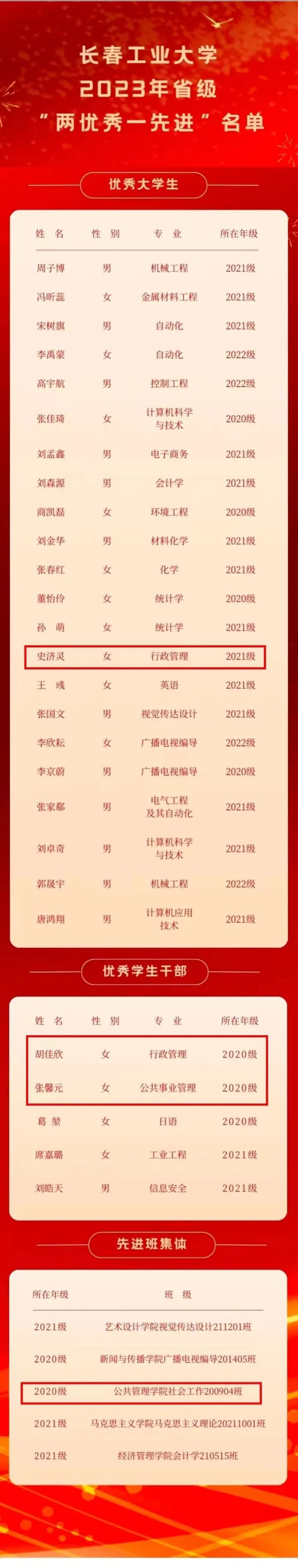 近期,吉林省教育厅发布《关于公布2023年吉林省普通高校省级优秀大学生(标兵)、优秀学生干部(标兵)和先进班集体名单的通知》,今年会官网近期,吉林省教育厅发布《关于公布2023年吉林省普通高校省级优秀大学生(标兵)、优秀学生干部(标兵)和先进班集体名单的通知》,今年会官网2021级本科生史济灵荣获吉林省普通高校“优秀大学生”荣誉称号,2020级研究生胡佳欣、2020级本科生张馨元荣获吉林省普通高校“优秀学生干部”荣誉称号,200904班荣获吉林省普通高校“先进班集体”荣誉称号。