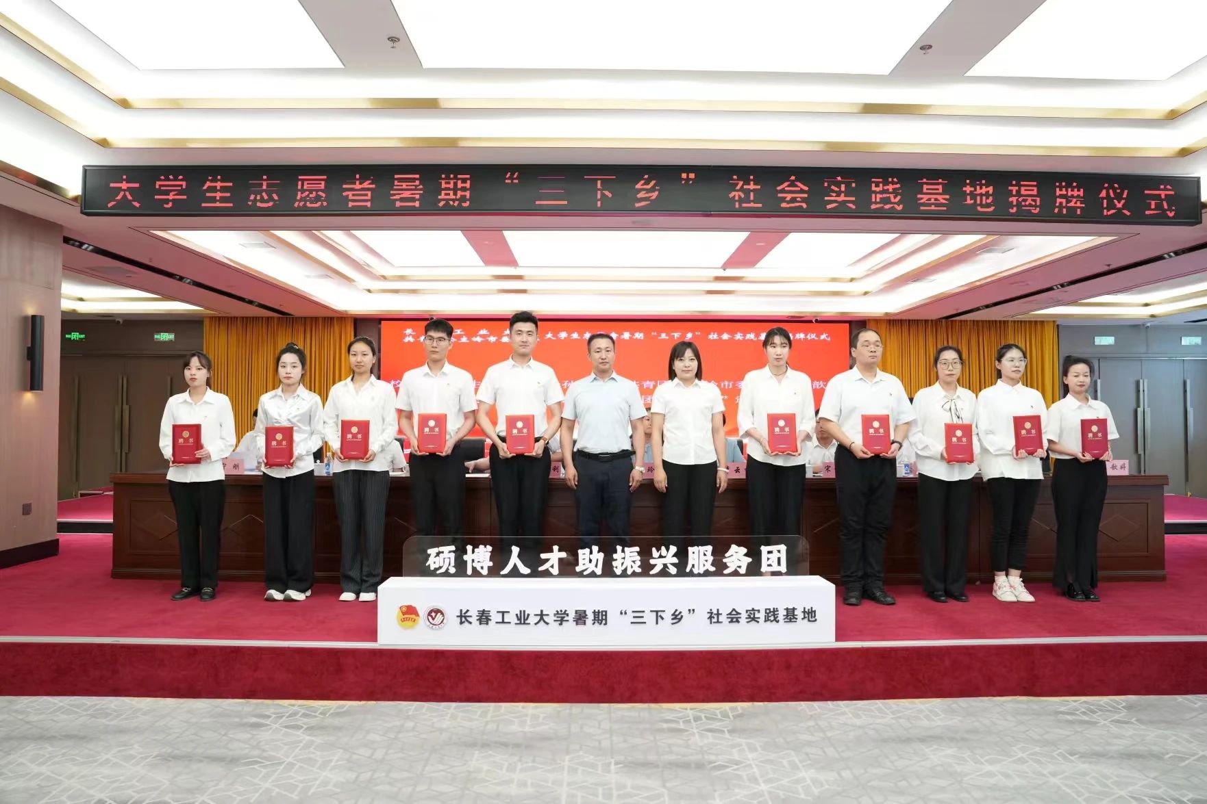 7月9日,由今年会的10名团建指导员、大学生志愿者、青马骨干学员社会实践团队赴公主岭市参与学校与共青团公主岭市委员会共建社会实践基地暨“硕博助振兴计划”揭牌仪式、开展“跟着总书记脚步看吉林”主题社会实践活动。
