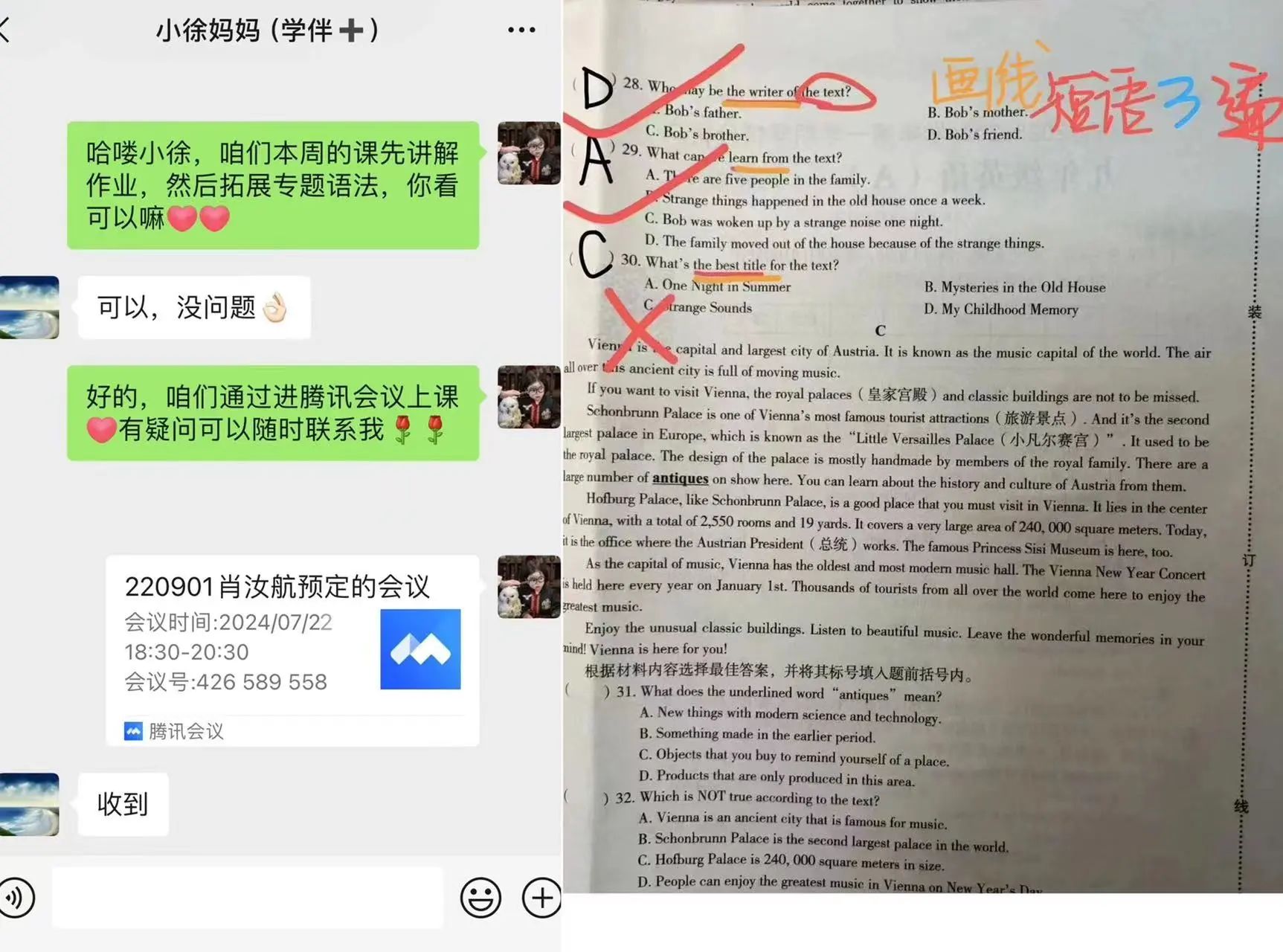 在这次“学伴+”志愿活动中,我的伴学对象是一位初三年级的妹妹,进行辅导的科目是英语。因为初三是升学的关键阶段,所以辅导的内容除了日常的作业之外,还添加了一定的拓展内容,例如语法专题的讲解和高级句式的表达。在讲解习题的过程中,主要以近期试卷的错题为抓手,通过详细分析考题内容,细致梳理知识,争取做到举一反三。同时不忘搭建课本与中考应试之间的桥梁,并且总结了一系列的答题技巧助力中考。