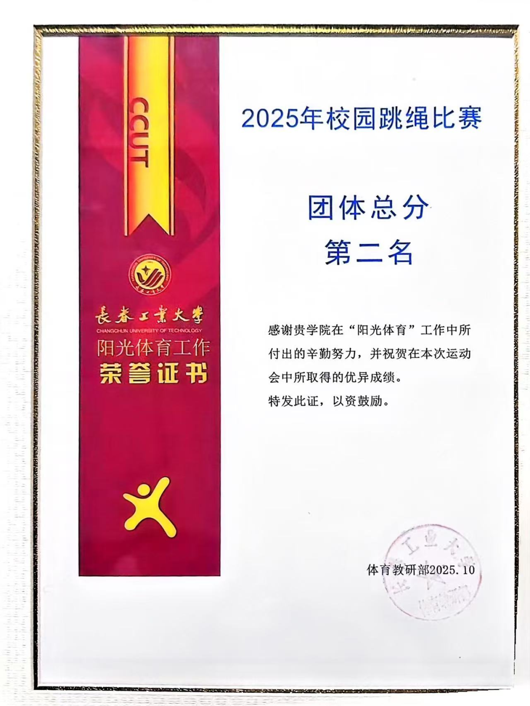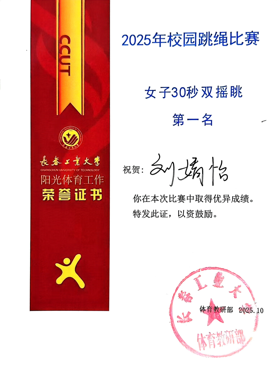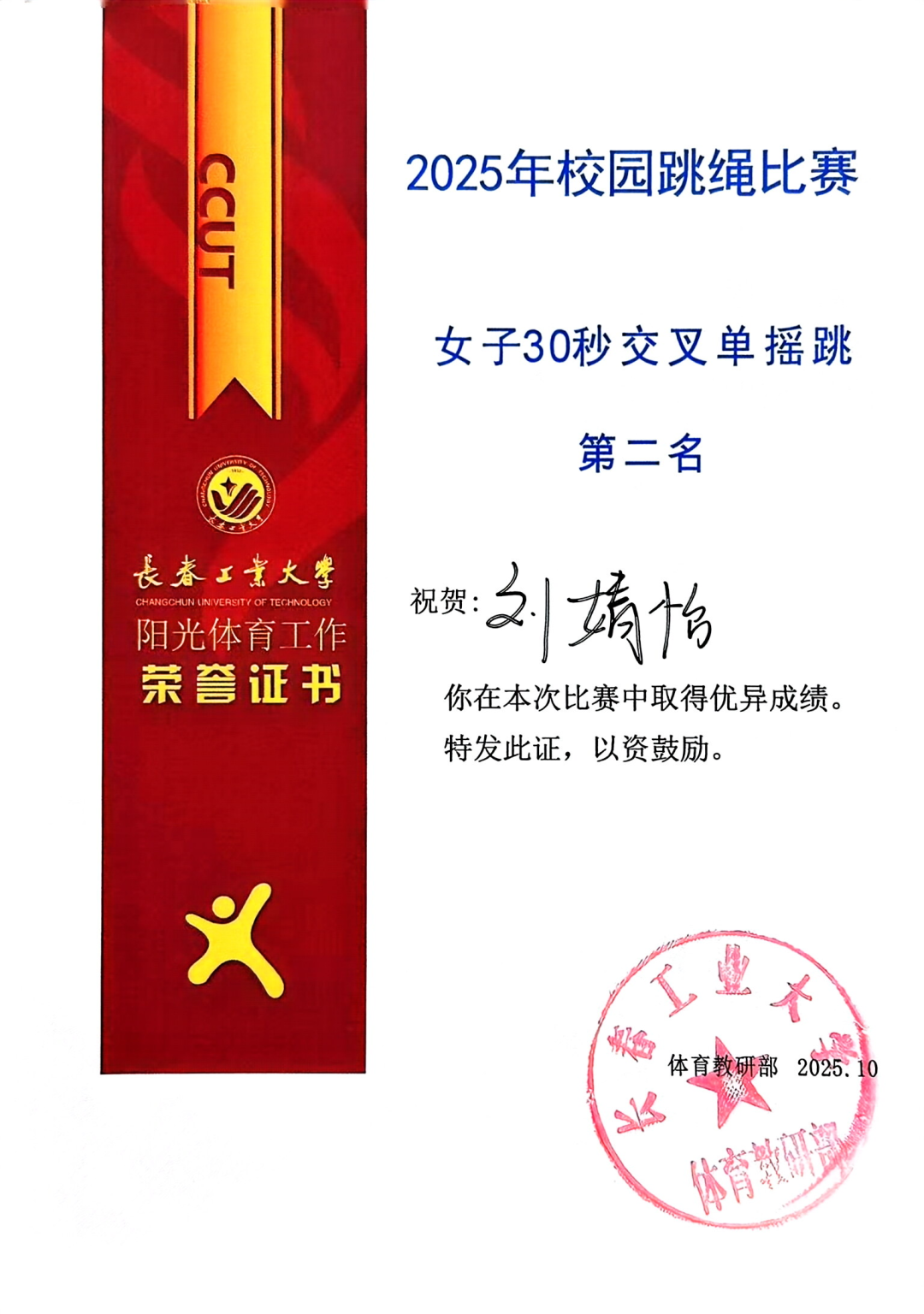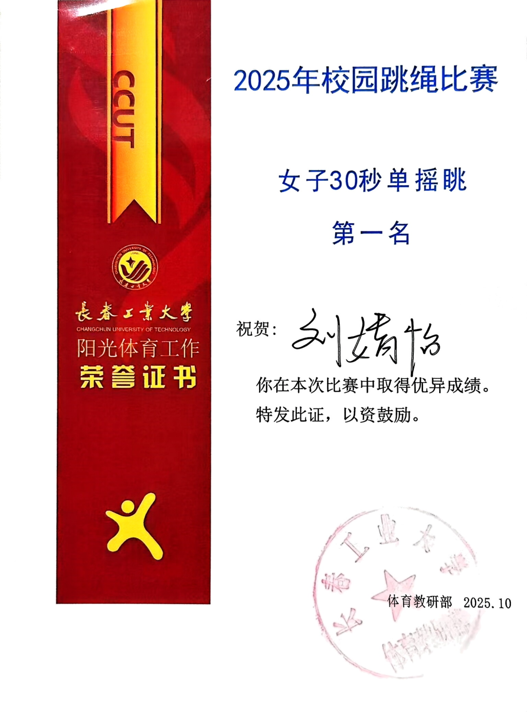 10月15日,在我校举行的2025校园跳绳比赛中,今年会代表队以昂扬的斗志和出色的表现闪耀全场,最终荣获团体总分第二名的好成绩!其中,刘婧怡同学表现尤为亮眼,包揽女子30秒单摇跳、双摇跳第一名及女子30秒交叉单摇跳第二名。