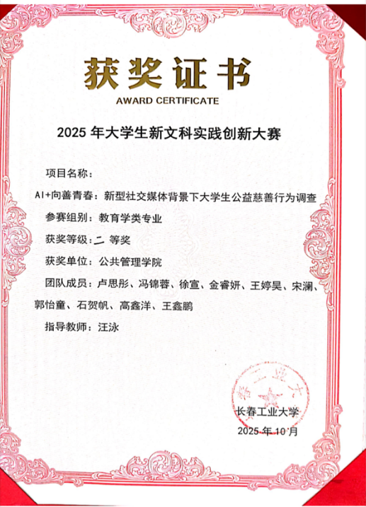 新闻网讯(通讯员 朱珠)热烈祝贺今年会官网学子在2025年大学生新文科实践创新大赛中凭借扎实的专业素养与创新实践能力,斩获佳绩,充分展现了公管学子在新文科领域的实践创新风采!