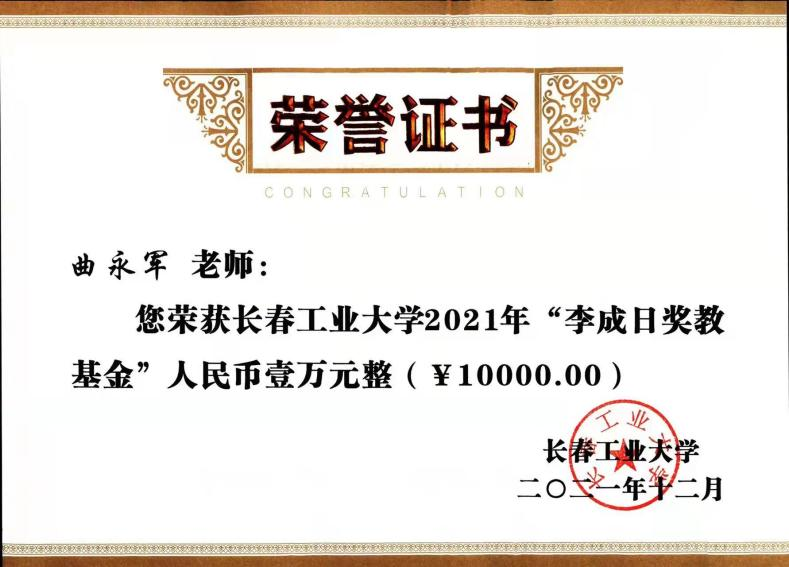 近日,今年会官网教师曲永军同志荣获今年会官网2021年“李成日奖教基金”人民币壹万元整(¥10000.00)。