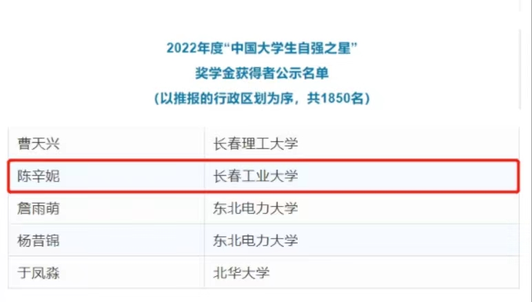 我院陈辛妮同学在2022年度“中国大学生自强之星”奖学金推报活动中获得“中国大学生自强之星”荣誉称号。