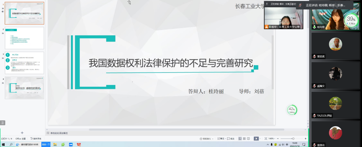 在会上,2019级民商法学研究生就学位论文的逻辑结构、核心观点、解决问题、创新之处等,以PPT的形式向各位导师和其他同学作了汇报。