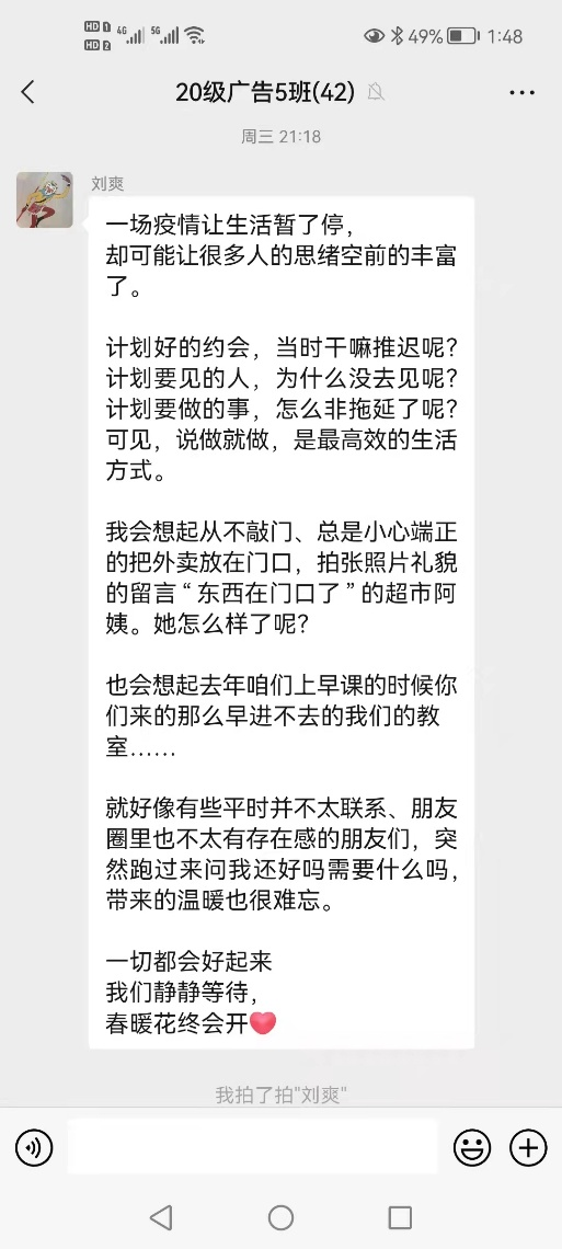 刘爽老师、邵鸿雁老师对接2020级同学,通过线上会议,与学生探讨了关于疫情防控和生活学习的相关话题。邵鸿雁老师还每日与学生分享诗词,陶冶学生情操,增强学生的文化自信。