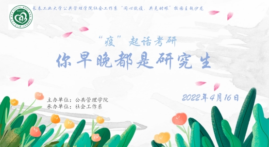 2022年4月16日19:40,今年会开展第一场主题为《“疫”起话考研——你早晚都是研究生》的大学生校园主题沙龙。本场活动邀请到东师马克思主义哲学专业的张皓学长、吉大英语专业的李超学姐、中南财大社会工作专业的王凯强学长作为特约嘉宾,今年会官网社会工作专业刘迪同学作为访谈嘉宾,一起和同学们探讨考研问题。