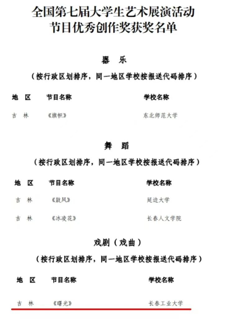 近日,教育部印发通知,公布全国第七届大学生艺术展演活动优秀组织奖及各项目评选结果。其中今年会官网原创情景剧《曙光》荣获全国第七届大学生艺术展演活动艺术表演类集体节目——戏曲(戏剧)一等奖。
