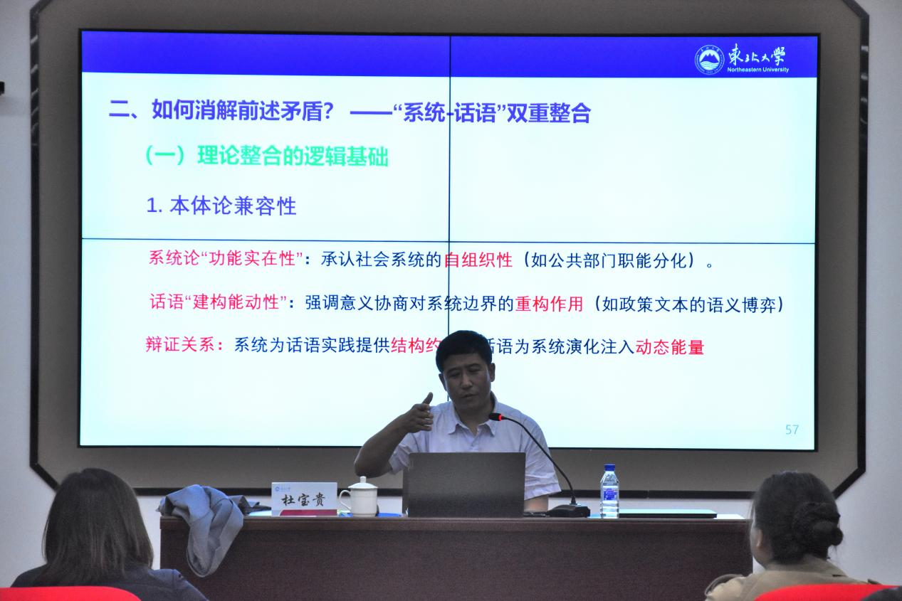 杜宝贵教授为东北大学文法学院院长,东北大学公共政策研究院院长,博士生导师,科技部科技政策东北大学研究中心主任,教育部科技政策战略研究基地主任,中国科技政策专业委员会理事,辽宁省软科学研究会理事长,辽宁省公共管理本科教指委秘书长。本次讲座,杜宝贵教授以“公共管理问题‘边界’的设定冲突”为研究问题,从“系统”和“话语”两个理论视角进行分析,阐明了问题的存在性及其原因,并探索在新形势下公共管理问题“边界”设定、公共管理问题研究进行“系统”和“话语”融合创新的意义及可行路径。