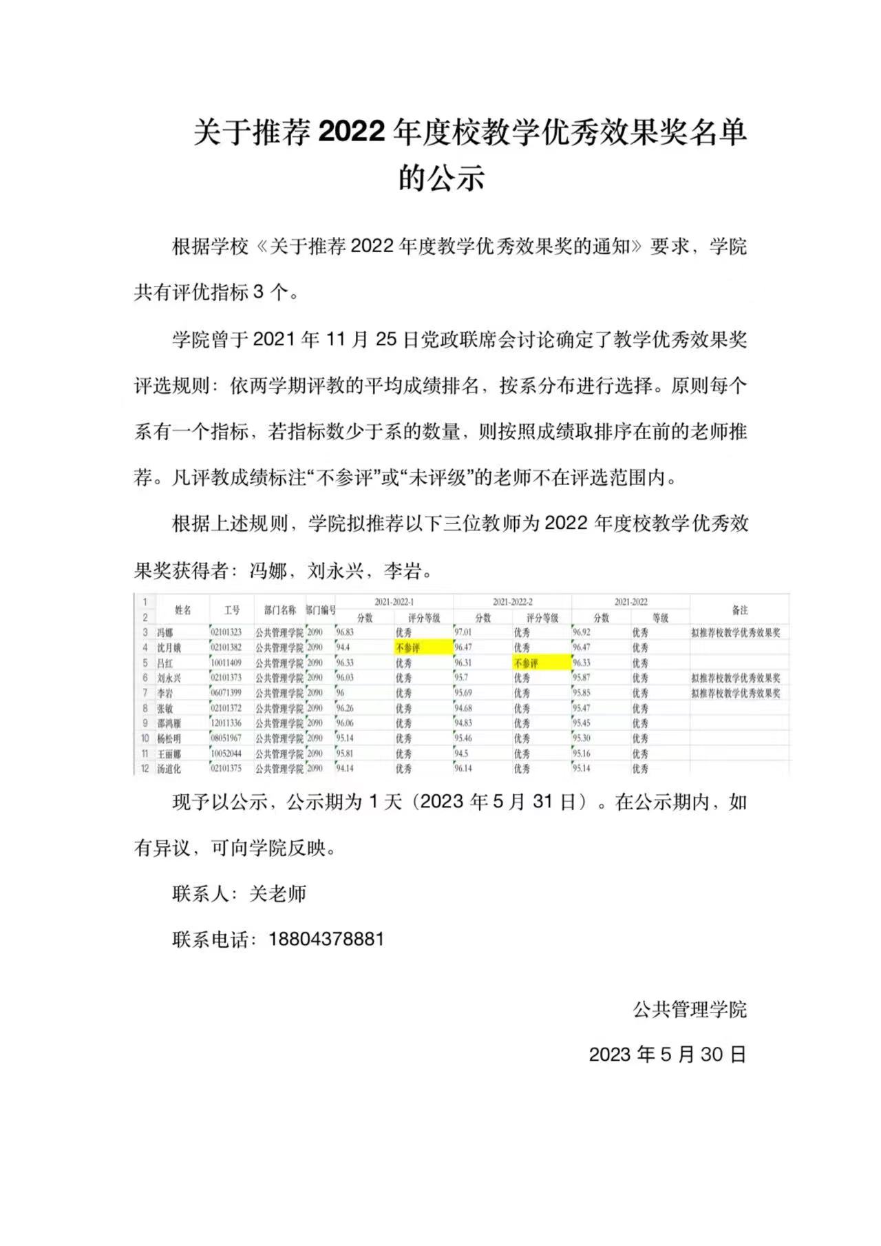 今年会关于推荐2022年度校教学优秀效果奖名单公示