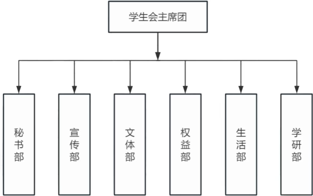 学生会设主席团(执行主席1人、轮值主席2人)及秘书部、宣传部、文体部、权益部、生活部和学研部六个部门。